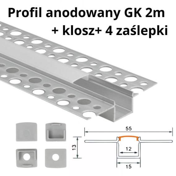 Unikalny profil GK 2m srebrny Anodowany z podtynkowym kloszem mlecznym! Stworzony z aluminium, o wymiarach 13x55x200. Gwarancja 2 lata. Odkryj teraz wyjątkowe LEDowe możliwości! #ProfilLEDGK