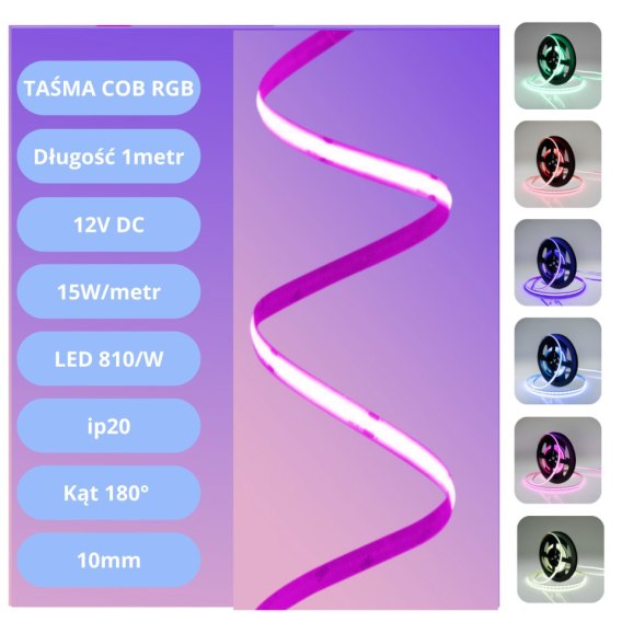 Taśma LED COB 810 to wyjątkowe rozwiązanie oświetleniowe o wielu zastosowaniach. Z mocą 15W/m i barwą RGB, ta taśma zapewnia różnorodność kolorów, umożliwiając dynamiczne efekty świetlne. Dzięki napięciu wejściowemu 12V DC, jest łatwa w instalacji i może być zasilana z różnych źródeł, takich jak akumulatory, zasilacze samochodowe lub zasilacze do taśm LED. Z ilością 810 diod na metr, taśma generuje intensywne oświetlenie, idealne do różnych zastosowań dekoracyjnych i oświetleniowych. Kąt świecenia 180° sprawia, że światło rozprzestrzenia się szeroko, zapewniając jednocześnie równomierne oświetlenie. Możliwość ściemniania pozwala dostosować jasność światła do preferencji użytkownika. Taśma ma szerokość 10mm, co ułatwia jej montaż w różnych miejscach. Z 5-letnią gwarancją, możesz mieć pewność, że taśma LED COB 810 będzie służyć Ci przez długi czas, zapewniając niezawodne oświetlenie i kreatywne efekty wizualne.