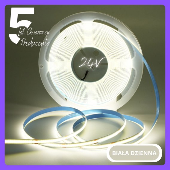 Taśma LED COB 480  w barwie białej dziennej  o długości 1 metra to doskonałe rozwiązanie oświetleniowe o wysokiej wydajności i szerokich możliwościach dostosowania. Taśma sprzedawana jest w odcinkach o długości 1 metra. Dzięki temu, kupując wielokrotność tego produktu, możesz dopasować jej długość indywidualnie do swoich potrzeb. Na przykład, przy zakupie 12 odcinków otrzymasz taśmę o długości 12 metrów w jednym kawałku. Pamiętaj jednak, że jeśli zależy Ci na taśmie zakończonej przewodem, możesz dokupić usługę lutowania taśmy LED. Posiada moc 9W na metr, zapewniając jasne i energooszczędne oświetlenie. Dostępne są różnorodne modele z barwami światła 4000K, co pozwala na wybór odpowiedniej atmosfery w zależności od potrzeb. Strumień świetlny wynosi 990lm na metr, co gwarantuje doskonale oświetlenie przy minimalnym zużyciu energii. Dzięki napięciu wejściowemu 24V DC, taśma jest łatwa w instalacji i bezpieczna w użytkowaniu. Z imponującą ilością 480 diod na metr, zapewnia równomierne i intensywne oświetlenie. Dodatkowym atutem jest możliwość przyciemniania, co umożliwia dostosowanie jasności do indywidualnych preferencji. Taśma ma niewielką szerokość 8mm, co ułatwia jej montaż nawet w miejscach o ograniczonej przestrzeni. Z gwarancją obejmującą 5 lat, można mieć pewność, że będzie ona niezawodna przez długi czas użytkowania.