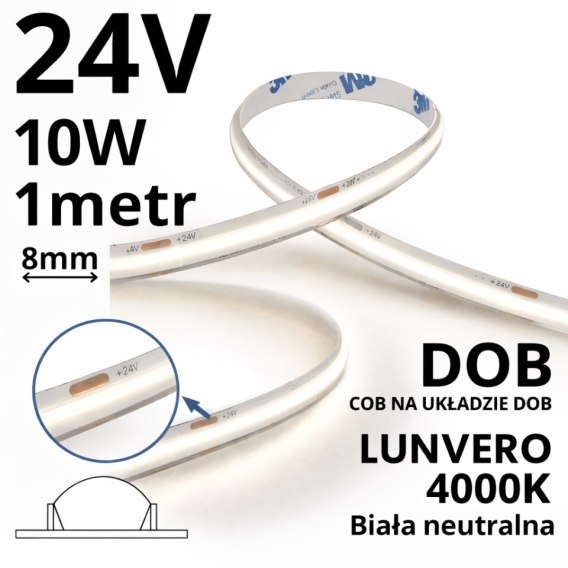 Taśma LED COB DOB o kodzie producenta 86979-1M to profesjonalne rozwiązanie o mocy 10W/m, zasilane napięciem 24V DC, w barwie 4000K - biała neutralna. Dzięki technologii COB DOB uzyskujesz jednolitą linię światła bez widocznych punktów, przy jednocześnie zwiększonej odporności mechanicznej, co ułatwia montaż i codzienne użytkowanie.
