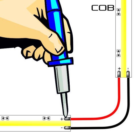 Usługa dotyczy zlutowania przewodu z dwoma odcinkami taśmy LED. Dedykowany przewód długości +/- 10cm jest wlutowany pomiędzy dwa odcinki Taśmy LED COB.